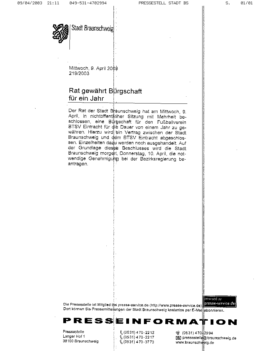 EINTRACHT BRAUNSCHWEIG Offizielle Pressemitteilung der Stadt Braunschweig