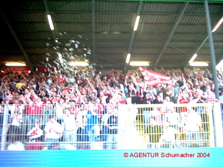 Stuckmann hält und muss sich einigen Wurfgeschossen der Düsseldorfer 'Fans'