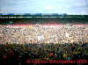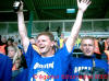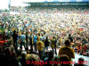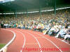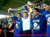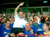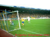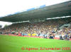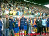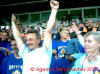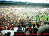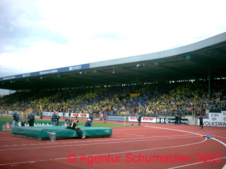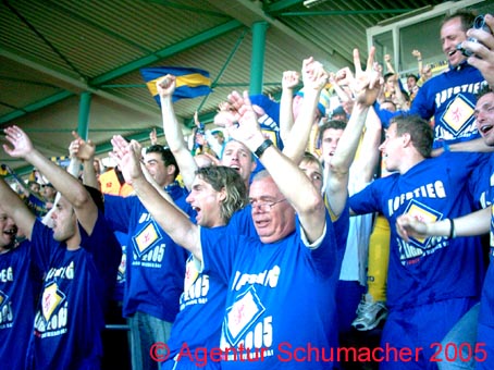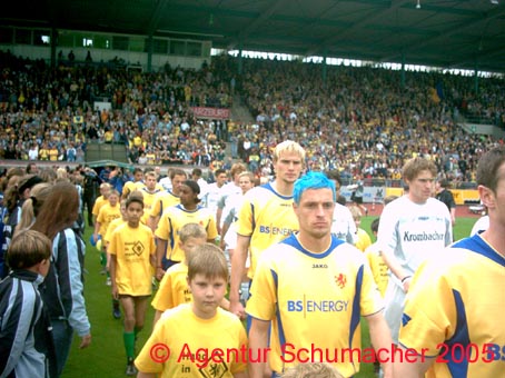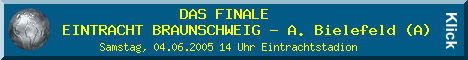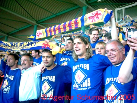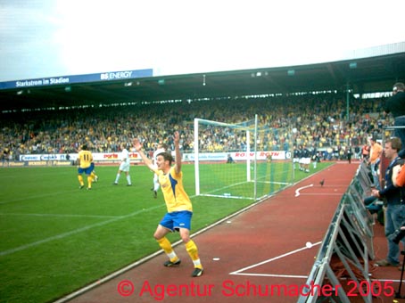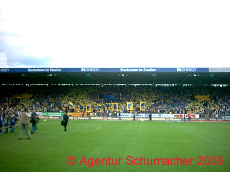 Nicht einmal hatte die Eintracht in dieser Saison ein Spiel nach einem Rückstand gedreht, doch zum Aufstieg mussten mindestens 2 Tore her. Ein Sturmlauf auf das Arminentor begann. Wie eine Mauer stehen die Eintrachtfans hinter der Mannschaft. Zweimal taucht Celikovic nach tollem Zuspiel in den freien Raum vor Gästekeeper Kalintas auf und vergibt zum Entsetzen der Fans. Und dann doch der Ausgleich : 61. Minute : Eine Ecke vom eingewechselten Bick köpft Daniel Graf zum viel umjubelten 2:2 in das lange Eck. Die Eintracht jetzt wieder vor Osnabrück in der Tabelle, aber nur Dritter hinter Paderborn und Lübeck. Alle Spieler wachsen über sich hinaus, wollen den Siegtreffer, wollen den Aufstieg. Amedick trifft nur die Torlatte, die Spannung ist nicht mehr zu überbieten. Graf mit einer vorbildlichen Leistung wird dann in der 74. Minute im Strafraum von den Beinen geholt, Elfmeter für die Eintracht. Kapitän Jürgen Rische schnappt sich sofort den Ball und versenkt den Strafstoss eiskalt in der Tormitte zum 3:2. Der Torjubel wird zum zum Orkan, doch noch gab es 15 Minuten zu überstehen. Die Eintracht spielt weiter nach vorne und hinten bügelt Keeper Stuckmann bei einem Schuss von Özkara seinen Fehler aus den Anfangsminuten mit einer Glanzparade aus. Arm in Arm zittern die Ersatzspieler am Spielfeldrand mit. Es folgten noch 2 gefährliche Freistösse für die Arminen und der Distanzschuss von Hag an die Latte, dann gab es kein Halten mehr für alles was Blau-Gelb am Körper und im Herzen trägt :