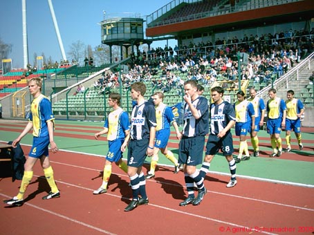 Die Löwen beginnen die zweite Halbzeit druckvoller und kommen endlich zu Torchancen. Kuru verfehlt nach 3 Minuten in der zweiten Hälfte nur knapp das Berliner Tor. David Krecidlo, der sich hinter dem Berliner Tor aufwärmte, (Wallschläger war bereits nach 36 Spielminuten für den verletzten Ante Covic eingewechselt, der Sohn von Manager Dieter Hoeneß, Sebastian Hoeneß in der 46. Minute für Kretschmer) gab die Anweisung an den Balljungen hinter dem Berliner Tor, langsam zu machen, dem Berliner Keeper den Ball nicht so schnell zur Ausführung der Abstösse zu geben. Eine Unsportlichkeit, die aber in der 57. Minute relativiert wurde : Freistoss an der Strafraumgrenze für die Eintracht nach Foul an Lars Fuchs und Bick trifft aus 17 Metern zum 1:0 für die Eintracht. Sicherlich etwas glücklich, weil der Ball abgefäscht wurde, aber nicht unverdient die Gästeführung. Jetzt hatten es die Berliner eilig, aber Krecidlo, angesprochen auf seine Aufforderung vor wenigen Minuten, zeigte sich wenig einsichtig. Eintracht will nachlegen, sucht die Vorentscheidung, aber die Berliner kontern auch mit 10 Spielern gefährlich. Hoeneß, Gott sei Dank nicht so treffsicher wie sein Vater, verfehlt völlig freistehend aus 10 Metern das Eintrachttor und Minuten später umkurvt Samba die Eintrachtspieler wie Fahnenstangen bei seinem Lauf vom eigenen Strafraum, doch Stuckmann entschärft mit einer Glanzparade den Schuss aus 15 Metern. Auf der Gegenseite trifft der eingewechselte Jürgen Rische nur die Latte. In der letzten Minute ist dann sogar der Berliner Torhüter Semghoun mit im Eintrachtstrafraum, doch der Hertha Freistoss wird eine sichere Beute von Torsten Stuckmann. 3 wichtige Auswärtspunkte erobert, alleiniger Tabellenführer der Regionalliga-Nord, ein Grund zum Feiern für die Mannschaft und die Fans... .